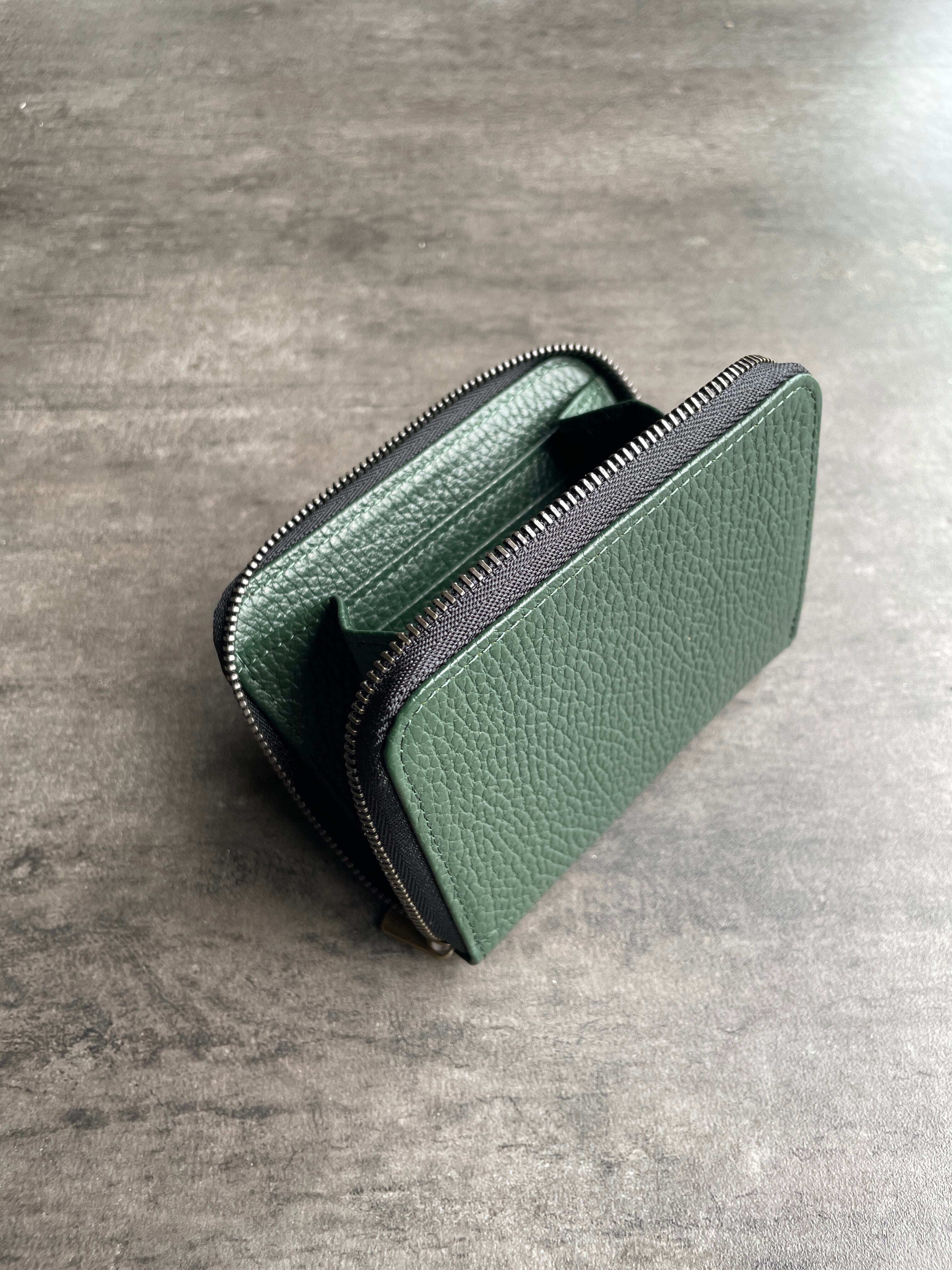 しなやかな手触りの上質なシュリンクレザーを使用した、手のひらに収まるサイズ感のジップパースです。