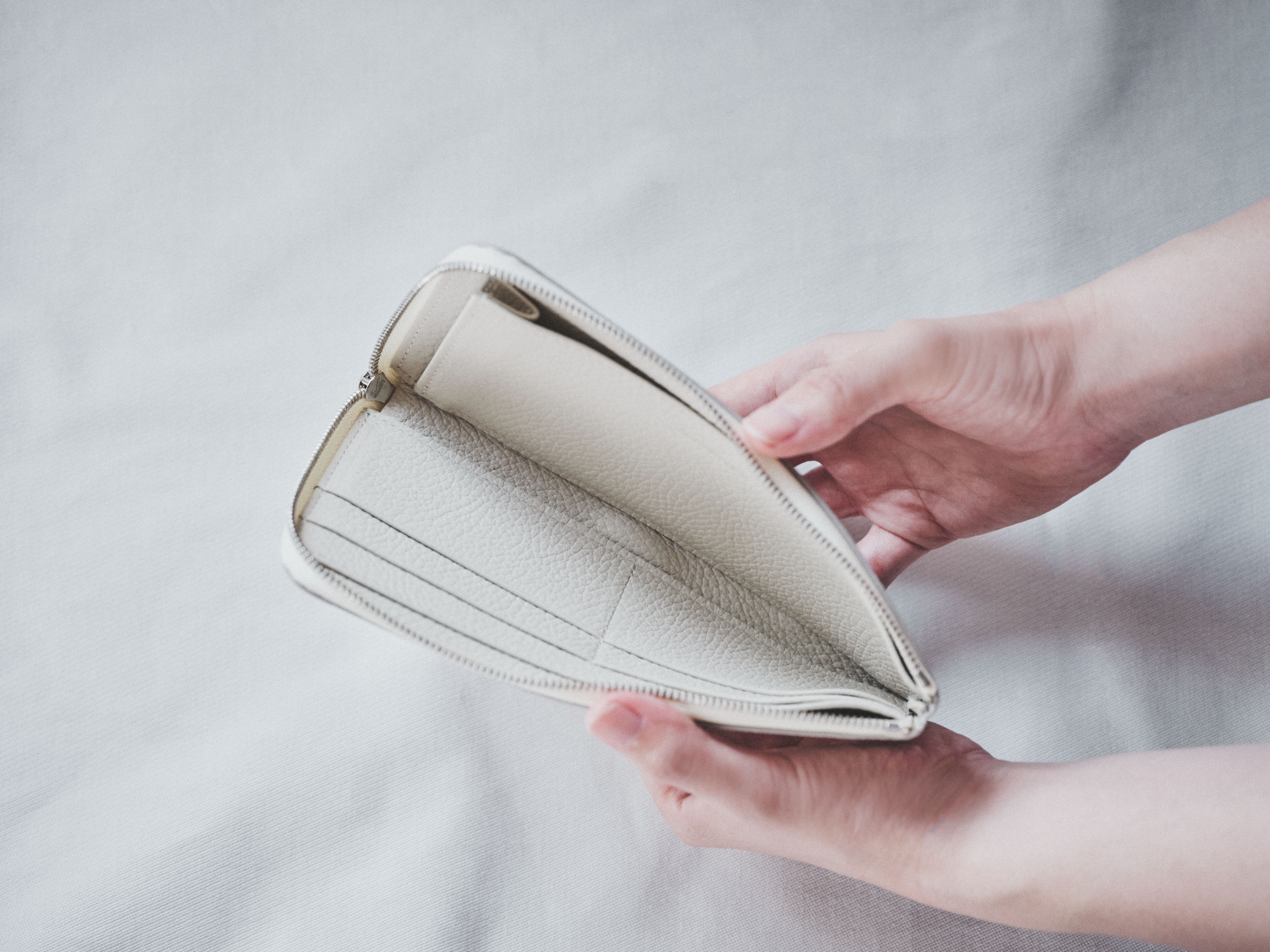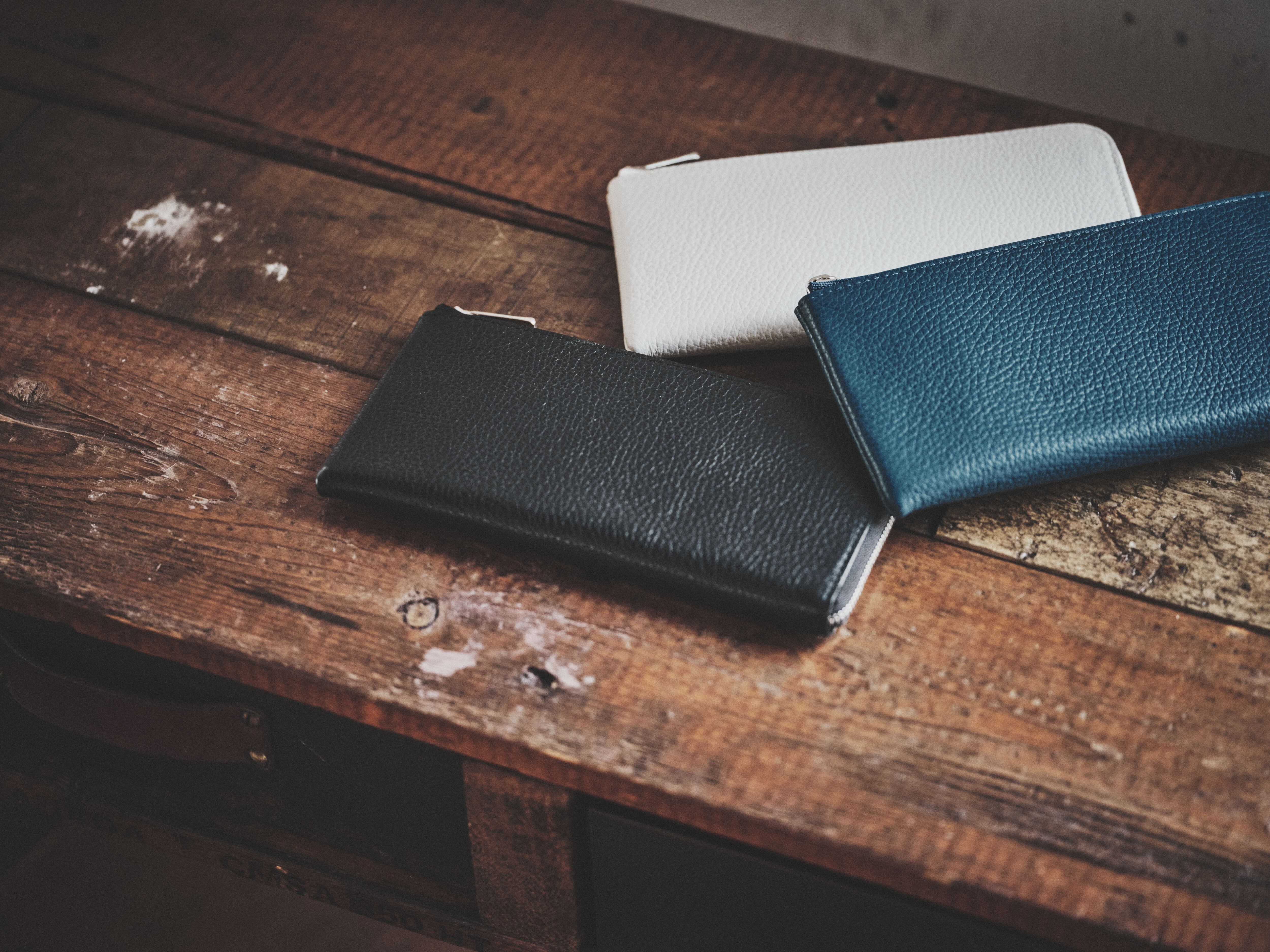 財布の中でも主流になっている長財布は、スマートさを最大限に生かすためシンプルと使い勝手を追求したL字ファスナーと、マチなしの超薄型のスリムなデザインに。
