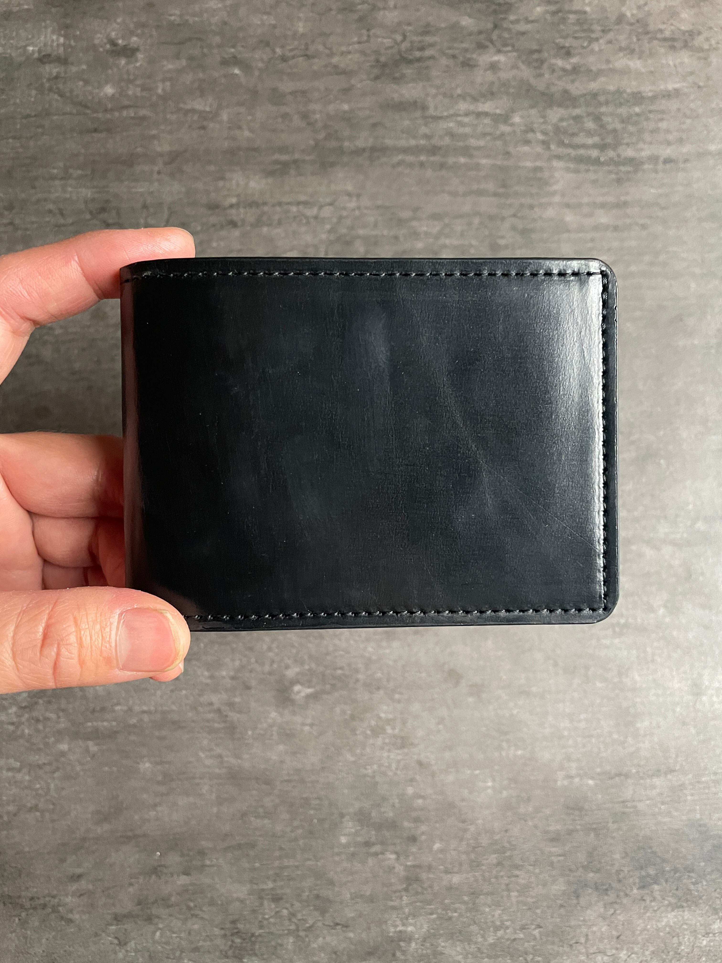 窓付きのカードスロットは内側の左右にあり、ゆとりを持たせているので4〜5枚重ねて入れることもできます。手のひらにすっぽりおさまるサイズ感とシンプルさはシーンを選びません。